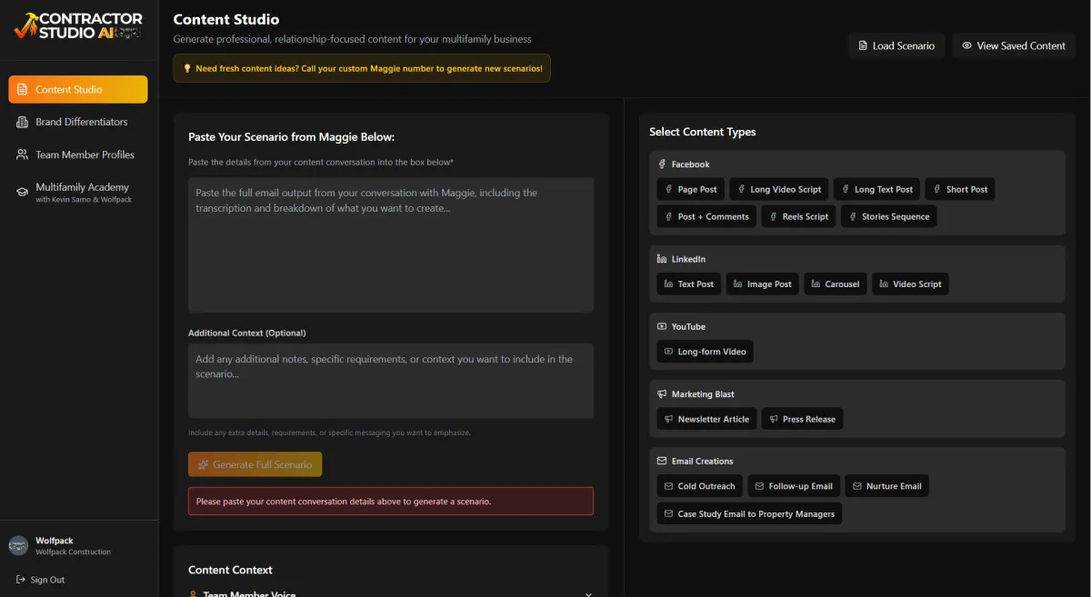 Bring your marketing questions, project wins, seasonal ideas, testimonials, or any CRM challenges to your call with Maggie. She’ll help you turn every idea into a custom plan, ready to launch through Contractor Studio AI and the Wolfpack CRM. From content to automation, you’ll have practical steps and expert support, every time.